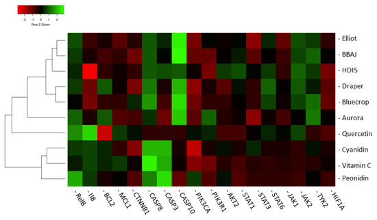 Hierarchical clustering dendrogram of different blueberry extracts (Elliot, Draper, Bluecrop, and Aurora), the extract of the blueberry–apple juice (BBAJ) from the human dietary intervention, and of four single compounds (quercetin, vitamin C, peondin, and cyanidin) based on the effect on the expression of 18 genes selected from a previously conducted human dietary interventions study. In order to compare these gene expression profiles with the profile generated in the human dietary intervention study, the gene expression profile of the human dietary intervention study is included as well (HDIS). Hierarchical clustering analysis was carried out using http://heatmapper.ca. As clustering method complete linkage was used, and distance between the clusters was computed based on Spearman rank correlation. The different conditions are displayed on the y-axis and the genes are shown on the x-axis.