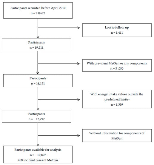 Flow chart depicting the selection process among participants of the Seguimiento Universidad de Navarra (SUN) cohort, 1999–2017; n: Number of participants; MetSyn: Metabolic Syndrome. a Total energy intake outside predefined limits (<800 or >4000 kcal/day for men, and<500 or >3500 kcal/day for women) [21].