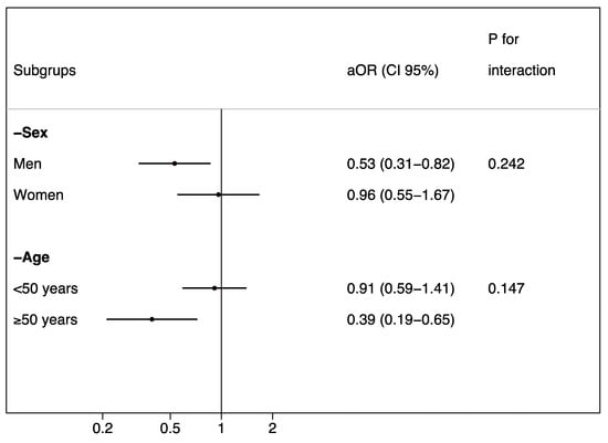 Risk of metabolic syndrome in the highest category compared to the lowest category of the Healthy Lifestyle Score. Stratified analyses (the SUN cohort); aOR: Adjusted odds ratio; CI: Confidence interval.