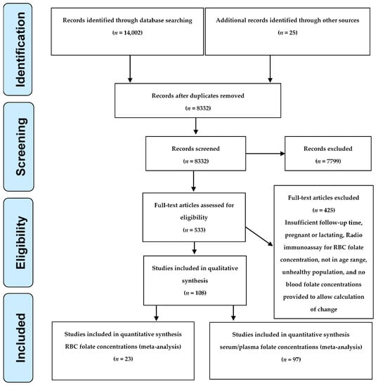 The initial literature search yielded 14,002 abstracts and 25 additional ones from other sources. After de-duplication and review, we identified 533 articles for full-text review. Of these, we included 108 articles in the qualitative synthesis (Figure 1, Table S1). In the end, the criteria for the meta-analysis were met by 23 articles for RBC folate and by 97 articles for serum/plasma folate. Individual articles could include both RBC and serum/plasma folate and/or multiple dosages (Table S1).