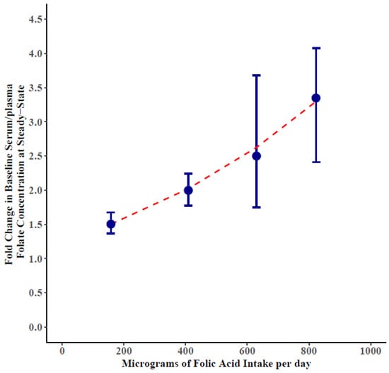 The threshold for population-level optimal red blood cell (RBC) folate concentration among women of reproductive age for the prevention of neural tube defects has been estimated at 906 nmol/L; however, the dose-response relationship between folic acid intake and blood folate concentrations is uncharacterized. To estimate the magnitude of blood folate concentration increase in response to specific dosages of folic acid under steady-state conditions (as could be achieved with food fortification), a systematic review of the literature and meta-analysis was conducted. Of the 14,002 records we identified, 533 were selected for full-text review, and data were extracted from 108 articles. The steady-state concentrations (homeostasis) of both serum/plasma and RBC folate concentrations were estimated using a Bayesian meta-analytic approach and one-compartment physiologically-based pharmacokinetic models. RBC folate concentrations increased 1.78 fold (95% credible interval (CI): 1.66, 1.93) from baseline to steady-state at 375–570 µg folic acid/day, and it took a median of 36 weeks of folic acid intake (95% CI: 27, 52) to achieve steady-state RBC folate concentrations. Based on regression analysis, we estimate that serum/plasma folate concentrations increased 11.6% (95% CI: 8.4, 14.9) for every 100 µg/day folic acid intake. These results will help programs plan and monitor folic acid fortification programs.