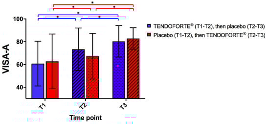 Progression of the mean VISA-A scores during the course of the study Data represent mean ± SD. Statistical analysis of changes in VISA-A scores at baseline (T1), 3 months (T2) and 6 months (T3) via linear mixed modeling. p values ≤ 0.05 were considered statistically significant and marked with an asterisk.