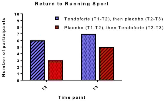 After 3 months respectively 6 out of 10 participants in group AB and 7 out of 10 participants in group BA reported their treatment as ‘good or excellent’. After 6 months 7 out of 9 participants in group AB and 7 out of 9 in group BA reported being satisfied with their treatment. The success of the intervention is also reflected in Figure 3, summarizing the number of participants that were able to return to their desired (running) sport, although none of them was able to return to their pre-injury level within the duration of the study. None of the participants in group AB reported that they stopped running sport activities after switching over from sCPs to placebo.