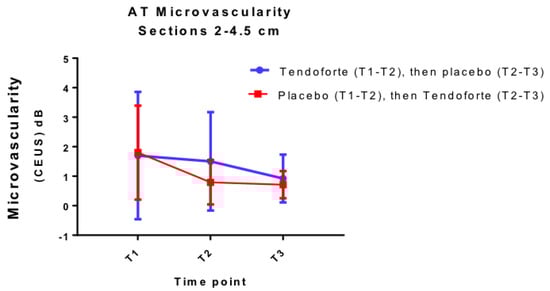 Both group AB and BA showed a significant (LMM, F (2,202) = 12.8, p < 0.001) decrease in tendon microvascularity over the course of the intervention as assessed by CEUS. As is illustrated in Figure 4, there is no difference in effect between the 2 interventions and no evidence for a benefit of sCP supplementation on tendon vascularisation. The difference at T2 for the 2 different randomisation groups is only marginally significant (LMM, F (2,202) = 2.81, p = 0.062), due to the greater variability in group AB compared to the BA group, in particular on that time point. Our LMM analyses indicate a significant interaction between microvascularity and VISA-A symptom score over the course of the study (Rc2: 0.68; LMM, F (2,196) = 3.32, p = 0.038). Non-fasting serum levels of mean total cholesterol, triglycerides and uric acid were unchanged at T2 and T3 (Table 2, ANOVA, p > 0.05)