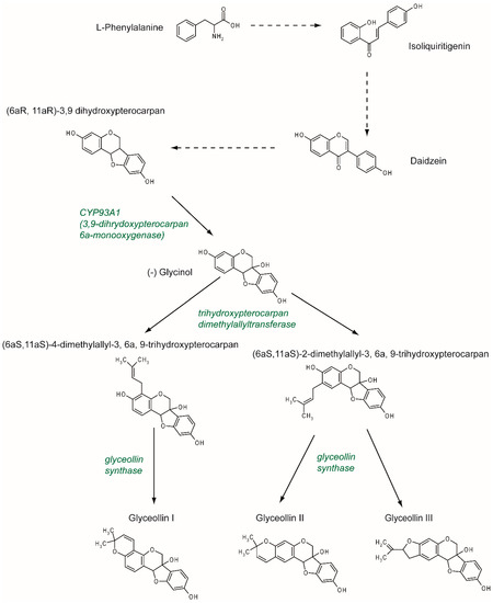 Previously described as hydroxyphaseollin in the early 70s [32,33], glyceollins belong to the family of phytoalexins, which are antimicrobial agents in plants. Glyceollins were characterized in soybeans after inoculation with the pathogen agent Phytophthora sojae. There are at least five glyceollins described to date that are produced via a complex metabolic pathway, even though GI, GII, and GIII are the most studied (Figure 2). Glyceollins are produced from the isoflavonoid branch of the phenylpropanoid pathway. Isoflavone daidzein is produced from phenylalanine and stored. Then, in the case of stress, daidzein will be metabolized into glyceollins. After multiple reduction steps, daidzein is transformed into (6aR, 11aR)-3,9 dihydroxypterocarpan. Pterocarpan is characterized by a pyrano-furano-benzene skeleton formed by the coupling of a B ring with the C ring of the isoflavonoid. Then, through the catalytic activity of CYP93A1 (also known as 3, 9 dihydroxypterocarpan 6a monooxygenase), the (6aR, 11aR)-3,9 dihydroxypterocarpan is metabolized into (-)-glycinol [34]. From glycinol, the metabolic pathway of glyceollins differs between glyceollin I and glyceollins II and III. In both cases, the next step consists of connecting a dimethylallyl group to glycinol through the activity of a trihydroxypterocarpan dimethylallyl transferase (also known as a prenyltransferase). For GII and GIII, dimethylallyl is connected to carbon 2, which leads to the production of (6aS, 11aS)-2-dimethylallyl-3, 6a, 9-trihydroxypterocarpan (also known as glyceollidin II) [35]. For GI, the connection of the dimethylallyl group occurs on carbon 4, which leads to the production of (6aS, 11aS)-4-dimethylallyl-3, 6a, 9-trihydroxypterocarpan (also known as glyceollidin I) [36]. In soybeans, approximately 77 prenyltransferases have been identified. Among them, five are induced in response to Phytophthora sojae, suggesting that they are involved in phytoalexin biosynthesis. A recent study [37] identified GmPT01 as a prenyltransferase that localized in the plastid and presented root-specific expression. These results suggested that GmPT01 could be involved in GI biosynthesis. The final step of glyceollin biosynthesis consists of the cyclization of the dimethylallyl group by glyceollin synthase. This enzyme belongs to the family of cytochrome P450 and was identified in 1988 [38]. To our knowledge, the specific enzymatic activity that leads to the different glyceollin isomers is not yet known.