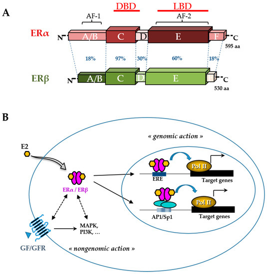 Estrogen receptor (ER) structure and action. The schematic structures of the two human ERα and ERβ and the percentage of homology between the different domains (annotated by the letters A to F) are indicated (A). Domains involved in DNA binding (DBD), ligand binding (LBD), ligand-independent transactivation function 1 (AF-1), and ligand-dependent transactivation function 2 (AF-2) are shown. The number of amino acids for each receptor is also indicated on the right side. Estradiol (E2) mediates numerous phenotypic effects in cells by binding to and activating ERs (B). E2 enters the cell through the lipid membranes and binds ER, which can be present in the cytoplasm and the nucleus. The activated ER forms a dimer to tightly fix chromatin directly at the estrogen-responsive element (ERE) sites or indirectly at activator protein 1 (AP1) or specificity protein 1 (Sp1) sites. ER is then able to remodel chromatin by recruiting cofactors and activating RNA polymerase II (Pol II), at target genes (genomic action). Besides, ERs can use rapid non-genomic action through the interaction with intracellular kinases (mitogen-activated protein kinase (MAPK), phosphatidylinositol 3-kinase (PI3K),…) and the growth factor (GF) receptor (GFR) pathways.
