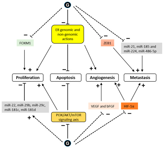 Signaling pathways modulated by glyceollins in the context of cancer cells. Glyceollins (G) have been shown to directly interact with the estrogen receptor (ER), exerting antagonistic effects on ER-dependent pathways. This anti-estrogenic effect of glyceollins prevents E2-dependent proliferation and angiogenesis. In addition, glyceollins induce cell apoptosis by direct ER genomic or nongenomic (membrane-initiated) effects. The expression of forkhead box M1 (FOXM1), a key regulator of the cell cycle, is downregulated by glyceollins. Cell growth and apoptosis can also be affected by glyceollins through ER-independent pathways. Glyceollins inhibit the activity of cytoplasmic kinases, such as the phosphatidylinositol 3-kinase/protein kinase B/mammalian target of rapamycin (PI3K/AKT/mTOR) signaling axis. Glyceollins repress the expression of growth factors, such as vascular endothelial growth factor (VEGF) and basic fibroblast growth factor (bFGF), and promote the expression of microRNAs (miRs) that act as tumor suppressors. Glyceollins also inhibit cell invasion and metastasis. These effects could be partially mediated by the inhibition of zinc finger E-box binding homeobox 1 (ZEB1) and hypoxia inducible factor 1 (HIF-1) expression as well as of microRNAs that enhance tumorigenesis (see text for references). Solid and dashed lines indicate direct and indirect effects, respectively. (+) indicates promoting effect and (-) indicates inhibiting effect.