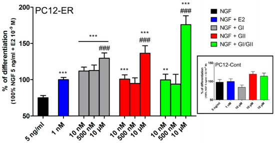 Using an in vitro cell model for neuronal differentiation [102], we tested the ability of glyceollins to enhance nerve growth factor (NGF)-induced neuritogenesis in the PC12 cell line (Figure 5). We have previously shown that PC12 cells stably transfected with ERα (PC12-ER) are able to develop a pseudoneuronal phenotype (neurite outgrowth) when treated with NGF [103,104,105]. As shown in Figure 5, our data clearly showed that GI and GII fully contributed to the neuritogenesis effect of NGF in PC12-ER (Figure 5), but not in PC12 control cells (PC12-Cont) that do not express ERα (Figure 5 –cartridge). This indicates that the effect of glyceollins depends on the presence of ER. It is interesting to note that Zimmermann et al. [28] previously reported that glyceollins strongly increased the expression of the nerve growth factor receptor (NGFR) gene, a member of the tumor necrosis factor receptor superfamily. This may explain the effect of glyceollins on neurite outgrowth in the PC12 model. Thus, although many more studies are needed to understand the effects of glyceollins on the CNS, these compounds might be used in the development of therapeutic treatments for CNS diseases.