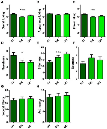 - Gayathri Devi, A.; Henderson, S.A.; Drewnowski, A. Sensory acceptance of Japanese green tea and soy products is linked to genetic sensitivity to 6-n-propylthiouracil. Nutr. Cancer. 1997, 29, 146–151. [Google Scholar] [PubMed]