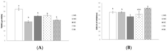 Effects on oxidative stress of MetS rats (MS), rats with fed with wheat control diet (WC, n = 10), wheat and oat control diet (OC, n = 10), A snack (SA, n = 10), and B snack (SB, n = 10). (A) TBARS activity and (B) SOD activity. Values are expressed as mean ± SEM. Values not sharing a common letter are significantly different (p < 0.05).