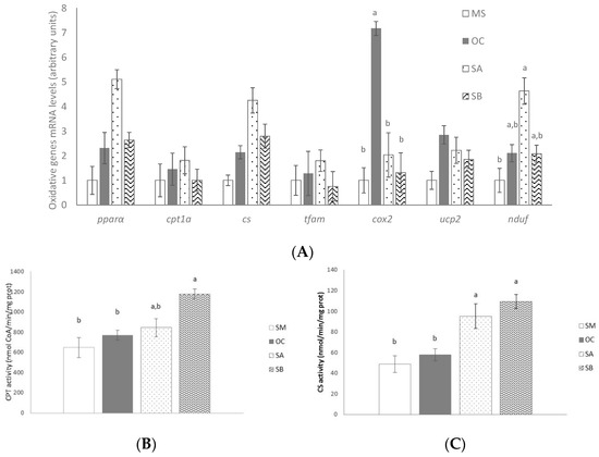 Effects on fatty acid oxidation of MetS rats (MS, n = 10), rats fed with wheat control diet (WC, n = 10), wheat and oat control diet (OC, n = 10), A snack (SA, n = 10), and B snack (SB, n = 10). (A) Oxidative genes mRNA levels, (B) CPT activity, and (C) CS activity. Values are expressed as mean ± SEM. Values not sharing a common letter are significantly different (p < 0.05). In the case of CPT1a and CS activities, p value for the comparisons SM and SB groups or OC and SB groups is p < 0.001.