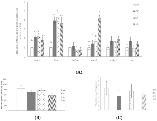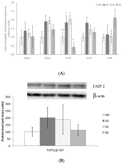 With regard to genes involved in liver fatty acid uptake, only in the case of SB group reduced gene expression of acsl1 when compared to OC and SA group was observed (Figure 5A). Neither OC diet nor snacks A and B modified protein expression of FATP2 and FATP5 (Figure 5B,C).