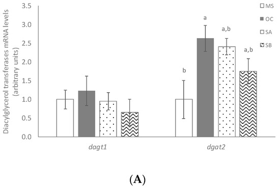 No changes were observed in lipases gene expression among the different experimental groups (data not shown). dgat1 and dgat2 gene expressions were measured in order to see the effects on TG assembly. OC diet increased dgat2 mRNA levels when compared to MS group (Figure 4A). By contrast, no snack-treatment effect was observed. Moreover, MTP activity was measured in order to clarify whether snacks administration reduced TG synthesis in liver through this enzyme, but significant changes were not observed among all the experimental groups (Figure 4B).