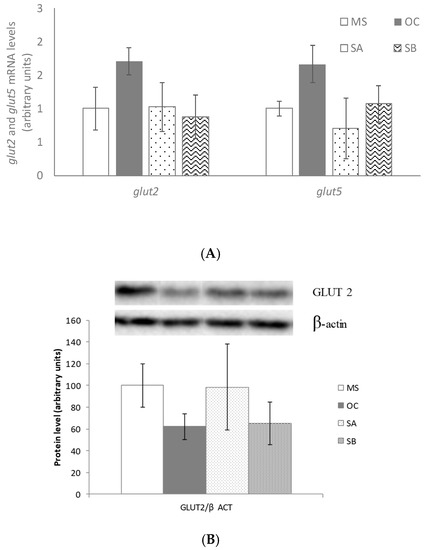 No changes were observed in glut2 and glut5 gene expression or protein level (Figure 6A–C)