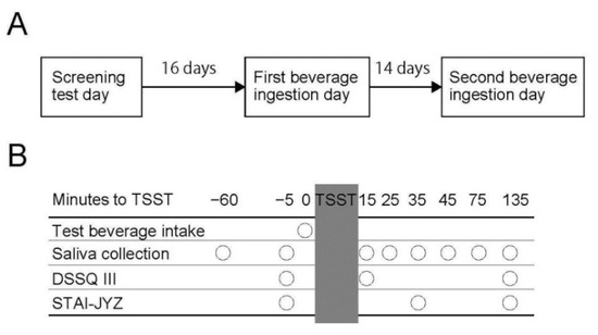 Schematic representation of test schedule. (A) Whole test schedule of this study. (B) Schedule of the test day. Timing of test beverage ingestion, saliva collection and questionnaire are shown by circles. DSSQIII, Dundee Stress State Questionnaire III; STAI-JYZ, State-Trait Anxiety Inventory-Form JYZ; TSST, Trier Social Stress Test.