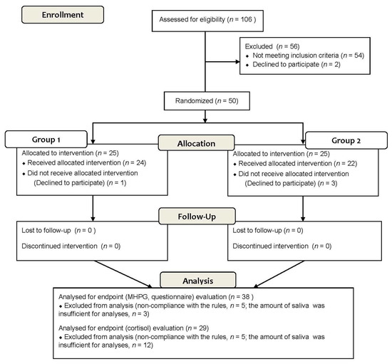 The entry criteria were as follows: (1) male and female subjects aged between 20 to 50 years old at the time of registration, (2) no history of chronic disease, (3) has feelings of mental stress, such as tension, blushing, increased heartbeat when talking in front of an audience, (4) agreeing to participate voluntarily and in writing, after receiving sufficient explanation of the purpose and content of this study, (5) able to attend the designated examination date and receive examination, and (6) judged able to participate by the study physician. The exclusion criteria were as follows: (1) receiving treatment for a disease, (2) regularly taking drugs or quasi-drugs other than for disease treatment purposes, (3) receiving treatment for, or have a history of, serious disease and/or thyroid gland disease, adrenal gland disease, and/or metabolic disorder, (4) receiving treatment related to psychological stress and/or using related pharmaceutical products, supplements and health foods, (5) taking antihistamine drugs; xerostomia, or have subjective symptoms of xerostomia, (6) receiving treatment for, or have a history of, drug addiction and/or alcoholism, (7) systolic and diastolic blood pressures over 160 mmHg and 100 mmHg, (8) have a drug allergy, food allergy, and/or possibility of allergy symptom onset, (9) have subjective symptoms of anemia, (10) predicted to, or have, life events which may affect the participant’s mental condition, (11) involved in a profession which includes public speaking or a sales position, (12) smoker, (13) unable to stop drinking alcohol during the day before, and at the end of each test on each inspection day, (14) unable to stop the intake of caffeine-containing foods or beverages from morning until the end of the test on each inspection day, (15) unable to sleep at night due to shift work or other reasons, (16) individuals whose work involves taking a holiday during the week, (17) individuals who do not naturally wake between 6:00 and 9:00 a.m., (18) individuals who and whose family work for a company manufacturing or selling healthy foods or functional foods, (19) individuals planning to participate in other clinical studies during this study period, (20) females planning a pregnancy during the current study or are pregnant or lactating, (21) individuals who have a significantly deviated body measurement value, (22) individuals considered unsuitable from their background investigation, and (23) participants judged as unsuitable by the principal investigator. Fifty subjects finally participated in this study.