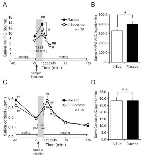 Effects of β-Eudesmol on saliva 3-methoxy-4-hydroxyphenylglycol (MHPG) and cortisol. (A) Effects of β-Eudesmol on saliva MHPG. Saliva MHPG levels were measured at −5, 15, 25, and 35 min. (B) Area under the curve (AUC) of saliva MHPG. (C) Effects of β-eudesmol on saliva cortisol. Saliva cortisol levels were measured at −60, −5 15, 25, 35, 45, 75, and 135 min. (D) AUC of saliva cortisol. Data are expressed as means ± SEM. β-Eud, β-Eudesmol; n.s., not significant; TSST, Trier Social Stress Test *, p < 0.05 between two groups. #, p < 0.05 in comparison to -5 min. ##, p < 0.01 in comparison to −5 min.