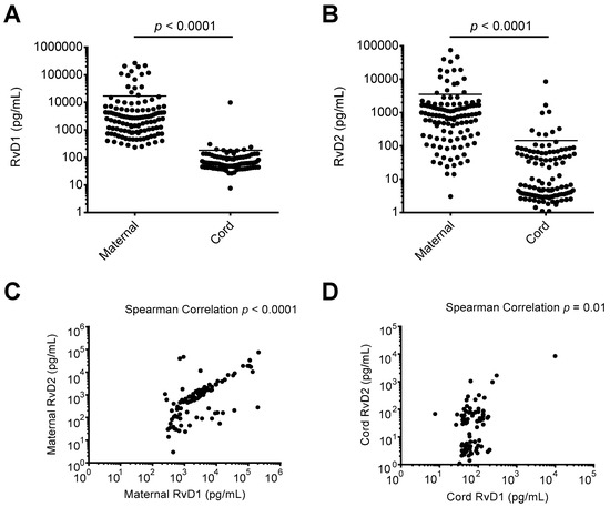 Recent preclinical and clinical investigations indicate a potential increase in circulating lipid mediator precursors in maternal blood in late pregnancy and during childbirth [21,22]. However, the levels of RvD1 and RvD2 in maternal-fetal circulation at the time of delivery have not been reported. Using maternal and cord blood plasma samples taken upon admission for delivery and at childbirth, respectively, we assessed the levels of DHA-derived SPM RvD1 and RvD2. As shown in Figure 1A,B, the median maternal blood plasma levels of RvD1 and RvD2 were 2617 pg/mL and 819.0 pg/mL, respectively. The median cord blood plasma levels of RvD1 and RvD2 were 61.0 pg/mL and 6.4 pg/mL, respectively. Maternal plasma levels of RvD1 and RvD2 were both significantly higher than measured cord blood plasma levels (p < 0.0001 for each analysis). As shown in Figure 1C, maternal RvD1 and RvD2 levels were strongly correlated, while cord blood RvD1 and RvD2 levels were also positively correlated (Figure 1D).