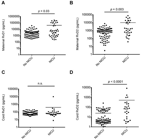 Comparison of maternal and cord blood plasma RvD1 and RvD2 levels and infant NICU admission at birth. Samples were stratified based on infant NICU admission at birth (yes/no) and maternal and cord blood plasma RvD1 and RvD2 levels were compared. (A) Maternal RvD1 levels; (B) maternal RvD2 levels; (C) cord RvD1 levels; (D) cord RvD2 levels. n.s.: no significant difference.