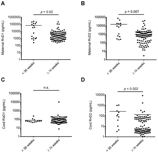Comparison of maternal and cord blood plasma RvD1 and RvD2 levels and gestational age at delivery. Maternal and cord blood RvD1 and RvD2 levels were separated into infants delivering at less than 36 weeks estimated gestational age versus infants delivered at greater than or equal to 36 weeks estimated gestational age and compared. (A) Maternal RvD1 levels; (B) maternal RvD2 levels; (C) cord RvD1 levels; (D) cord RvD2 levels. n.s.: no significant difference.
