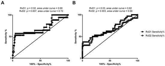Receiver-operating characteristic (ROC) curves of sensitivity and specificity of maternal RvD1 and RvD2 in discriminating preterm birth, defined as infants delivered at less than 36 weeks estimated gestational age versus infants delivered at greater than or equal to 36 weeks gestational age (A), and NICU admission (B) outcomes.