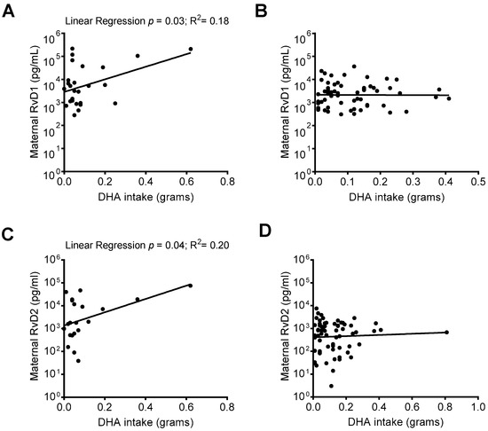 RvD1 and RvD2 are biosynthesized from the n-3 fatty acid DHA. When comparing SPM levels in mothers who responded to an FFQ including DHA intake data, we identified that in mothers whose infant was admitted to the NICU upon delivery, there was a positive association between increased DHA intake and maternal plasma RvD1 and RvD2 levels (Figure 5A,C), but not in mothers whose infants were not NICU-admitted (Figure 5B,D).