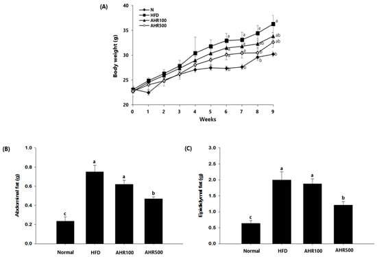 Effects of AHR on body weight changes and fat weight in high-fat diet (HFD)-induced obese mice. Body weight (A) was measured during 9 weeks. Abdominal (B) and epididymal (C) fat weights are shown. Data are expressed as mean ± SEM (n = 6–8). Values with different letters are significantly different at p < 0.05.