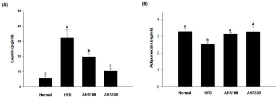 Effects of AHR on serum leptin (A) and adiponectin (B) concentrations in HFD-induced obese mice. Data are expressed as mean ± SEM (n = 6–8). Values with different letters are significantly different at p < 0.05.
