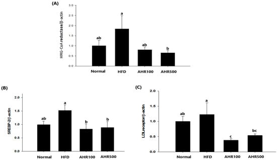 Effects of AHR on hepatic mRNA levels of HMG-CoA reductase (A), SREBP-2 (B), and LDL receptor (C) in HFD-induced obese mice. mRNA expression level was determined by real-time RT-PCR quantification and normalized to that of mRNA β-actin. Data are expressed as mean ± SEM (n = 6–8). Values with different letters are significantly different at p < 0.05.