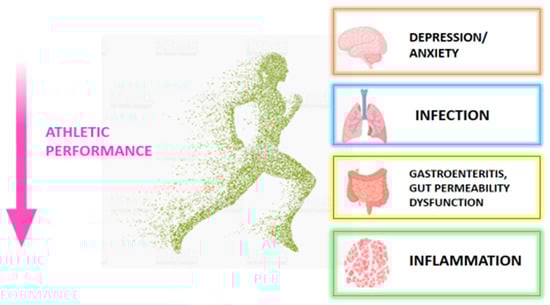 Overtraining can lower the immune system and in turn result in an “open window” period, where sensitivity to infection is increased [126,149]. Athletes are vulnerable to GI, URTI, and skin infections [150].