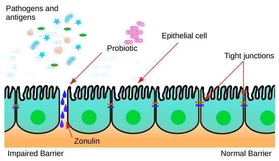The mucosal layer of the intestine is made up of several constituents namely; enterocytes and epithelial cells, which are interconnected by tight junctions. This intestinal barrier is pivotal in nutrient and water absorption, while preventing harmful substances entering the bloodstream [140,141]. During intense continuous exercise, cardiovascular and thermoregulatory responses augment the blood flow, increasing the phosphorylation state of the tight-junction proteins consequently increasing their permeability (Figure 2). Increased permeability can cause; vulnerability to allergies and infections, along with various gastrointestinal complaints [142]. A randomized, double-blinded, placebo-controlled trial has investigated two probiotic brands in relation to markers of intestinal barrier integrity on 23 endurance male athletes. The probiotics of choice were Ecologic®Performance (B. bifidum W23, B. lactis W51, Enterococcus faecium W54, Lb. acidophilus W22, Lb. brevis W63, L. lactis W58) and OMNi-BiOTiC®POWER (E. faecium W54, Lb. acidophilus W22, Lb. brevis W63, L. lactis W58, B. bifidum W23, B. lactis W51). The study investigated the concentration of Zonulin in faeces, a marker of impaired gut barrier. The study concluded that the probiotic treatment effectively decreased Zonulin concentrations in faeces from above normal to below normal, during the 14 days of the study, when compared to a placebo [142].