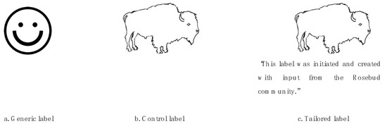 The tailored label was developed by collaborators from the Rosebud Food Sovereignty Initiative, Sinte Gleska University, which is the tribal university of the Rosebud Sioux Tribe, and the University of Nebraska–Lincoln. Primary input for the design of the label came from local collaborators. The tailored (and control) label featured an image of a bison. The bison image was identified by local collaborators as a culturally relevant image associated with notions of health and strength. Therefore, we hypothesized that the image would invoke participants’ cultural identity, rendering the label more salient and prompting participants to consider health attributes. The tailored label included text around the bison image stating that the label was the product of a local, community-led initiative, which may communicate injunctive social norms [19,20]. We hypothesized that the injunctive norm messaging would increase the likelihood that people would choose the healthier item relative to the generic label. The generic label was chosen based on previously published research that found the image—a smiley face—to be highly effective for the average consumer [11]. Label images are displayed in Figure 1.
