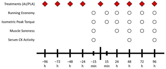 The experimental design of the study. The biggest dash represents downhill running. AJ: antioxidant juice; PLA: placebo; CK: creatine kinase.