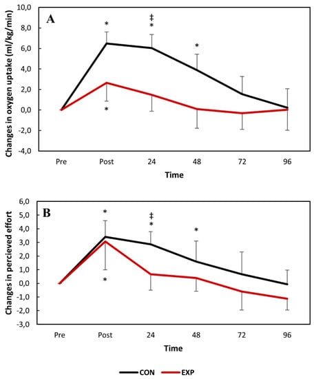 The absolute changes in oxygen uptake (A) and perceived effort (B) over time following downhill running. * p < 0.05 compared to the baseline values in the same group. ‡ p < 0.05 compared to the experimental group at the same time-point. CON: control group; EXP: experimental group.