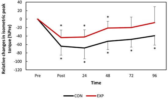 The relative changes in isometric peak torque over time following downhill running. * p <0.05 compared to the baseline values in the same group. CON: control group; EXP: experimental group.