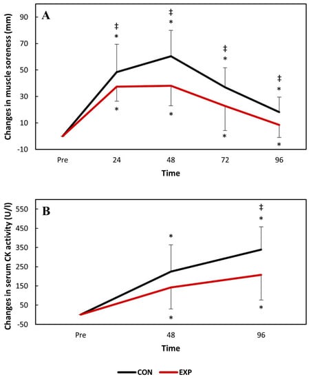 The changes in knee extensor muscle soreness (A) and serum creatine kinase (CK) activity (B) over time following downhill running. * p <0.05 compared to baseline values in the same group; ‡ p <0.05 compared to the experimental group at the same time-point. CON: control group; EXP: experimental group.