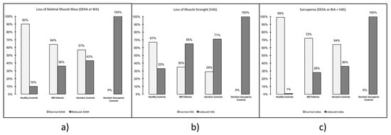 Percentage of sarcopenia in the study population: IBD patients, healthy controls, geriatric controls and geriatric sarcopenic controls. (a) Loss of skeletal muscle mass, (b) loss of muscle strength, and (c) loss of skeletal muscle mass and muscle strength: sarcopenia. Abbreviations. IBD: Inflammatory Bowel Disease; DEXA: Dual Energy X-ray Absorptiometry; BIA: Bio-Impedensometric Analysis. VAS: Visual Analogue Scales. ASMI: Appendicular Skeletal Mass Index.
