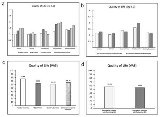 Sarcopenia and quality of life: (a) EQ-5D—study population; (b) EQ-5D—sarcopenic patients with remitting and relapsing IBD; (c) visual analogue scales (VAS)—study population; and (d) VAS—sarcopenic patients with remitting and relapsing IBD. Abbreviations. IBD: Inflammatory Bowel Disease; VAS: Visual Analogue Scale.