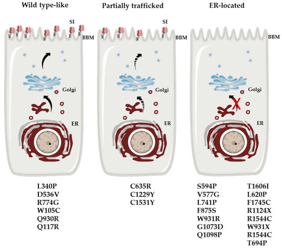 The main symptom in CSID is osmotic diarrhea, often acidic, since disaccharides can cause an osmotic force, which drives water into the gut lumen []. Bloating, stomach pain and gas are further symptoms of CSID. While unequivocal data on the existence of genetically-determined carbohydrate malabsorption due to MGAM do not exist, the maltase and glucoamylase activities of this enzyme complex are substantially reduced in many cases of CSID. One possible explanation for this reduction is that SI contributes to about 60–80% of the total maltose digesting capacity in the intestine. CSID is elicited by single-nucleotide polymorphisms in the coding region of the SI gene. These mutations are distributed over both domains of SI []. Biochemical, cellular and functional analyses of SI mutants established the concept of phenotypic heterogeneity and classified the SI mutants into groups that vary in their intracellular localization, cell surface localization (apical/basolateral), proteolytic processing and function [] (Table 2). Some of the SI mutants are blocked in the endoplasmic reticulum (ER) or the ER-Golgi intermediate compartment (ERGIC) and cis-Golgi [,] or are normally trafficked along the secretory pathway, but missorted to the basolateral membrane [,]. Other mutants undergo aberrant intracellular cleavage [,] or are characterized by an increased turnover rate (Figure 1) [].