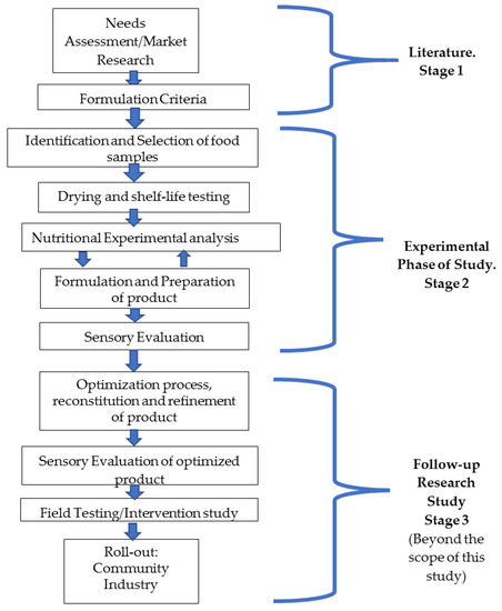 Step 1—Needs assessment/market research: Besides relying on the information provided by Malawian collaborators, a thorough desktop assessment was done to ascertain the food and nutritional challenges affecting infants and young children in Malawi. The literature search was done through Google Scholar, the Demographic and Health Survey (DHS) website for Malawian journal articles, Medline or PubMed, Cochrane Library, and Web of Science. Articles were searched using varying keywords like “infant,” “nutrition,” “infant food,” “infant weaning,” “complementary food,” “baby food,” “infant formula,” “infant feeding,” “infant nutrition,” “infant weaning formula,” “6–23 months children,” “introduction of complementary foods,” and “infant and young children feeding.” All articles related to the topic were considered, but priority was given to articles not more than five years old.