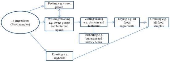 Step 5—Drying: A solar dehydrator, drum, and scientific ovens were used for drying in Malawi [24]. However, drying for this study was restricted to an electric/scientific oven. Food samples such as uncooked goat meats were treated with 3.5% salt and 3% vinegar/lemon juice, where appropriate, before being dried in an oven (as was done in Malawi). Butternut squash, plantains, and sweet potatoes were peeled, washed with water, cut open to remove the seeds (in the case of the butternut), and chopped into small pieces to enhance the drying process. Butternut squashes/pumpkins, sweet potatoes, and carrots were precooked before drying to avoid a raw taste and enhance the doneness. Most of the food samples (fruit and vegetables) were slowly dried at 65 °C to retain the quality of yield, while goat meat was dried at a higher temperature (127 °C) to prevent microbial activity. Food samples were typically dried within 24 to 48 h, ground, and temporarily stored in Ziploc bags at ambient temperature before analysis. Figure 2 describes the food processing approach adopted.