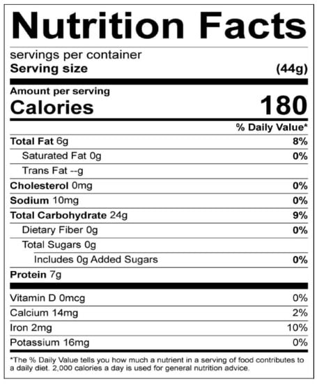 Step 8—Formulation and preparation of product: Formulations were based on the results of the nutrient composition of the analyzed food samples in accordance with Codex Alimentarius (CA) recommendations [28]. The results obtained for each category of nutrients were entered into the ESHA Food Processor as ingredients for 13 separate analyzed food samples and thereafter combined to form five different nutrient-dense recipes of complementary foods. The ESHA Food Processor was used to analyze the recipes and nutritional values obtained from total grams of each ingredient used (recipe quantifications) and generate corresponding food labels, as shown in Figure 3. The serving size specifications of the food labels aided in meal preparation.