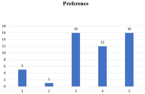 Additionally, the results in Figure 4 show that Recipes 3 and 5 are the preferred recipes (n = 16). Since both preference and overall acceptability tests were conducted simultaneously with the same tool, the highest mean score ± SD for the overall acceptability was 5.82 ± 0.87, in favor of Recipe 5. Therefore, a rank ordering of these five recipes based on the results of the sensory evaluation sessions shows that Recipe 5 (16) is the most preferred, followed very closely by Recipe 3 (16) and then Recipe 4 (12).