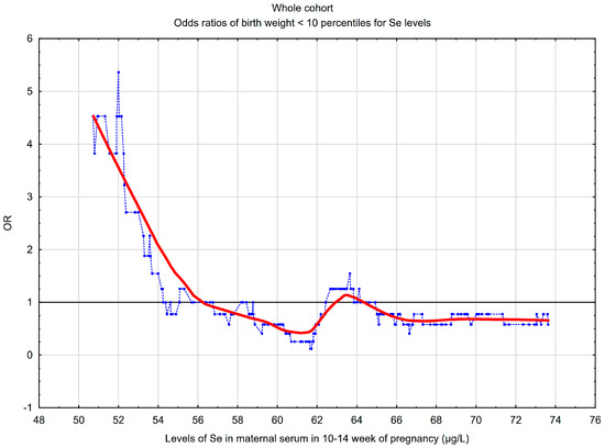 The risk of SGA newborns (<10th percentile) for maternal serum selenium (Se) concentrations in the 10–14th week of pregnancy, in the whole cohort (n = 240). The graph shows the changes in the odds ratio (OR) of SGA, calculated on a sliding window with respect to the changes in the selenium concentrations. The window width adopted was 30 observations. The points (blue) correspond to the odds ratios of SGA in a window containing a fixed number of neighboring cases (the center of the window is for a given Se concentration value). The curve (red) represents the SGA risk profile smoothed with the Lowess method. The horizontal line (black) marks the reference line for OR = 1; the points above the line indicate an increased risk (OR >1).