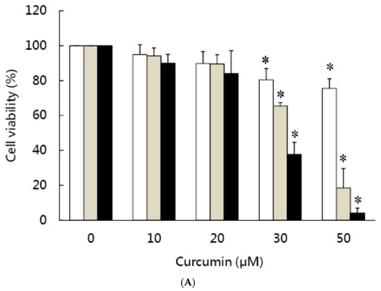 Using direct cell counting, cell numbers were quantified after trypsinization using a hemocytometer. Using the MTT assay, cells were seeded onto 96-well plates at approximately 1 × 103 cells/well in 100 μL of DMEM containing 0.5% FBS. After incubation with curcumin, 15 μL of 3-(4,5-dimethylthiazol-2-yl)-2,5-diphenyltetrazolium bromide (MTT; USB, Amersham Life sciences, Cleveland, OH, USA) was added (final concentration 0.5 mg/mL) for 4 h, then 100 μL of DMSO was added to dissolve the formazan crystals formed and the optical density was measured on an ELISA plate reader using test and reference wavelengths of 570 and 630 nm, respectively.