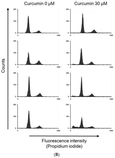 Curcumin, a yellow phenolic component of turmeric, is derived from the rhizome of Curcuma longa L. and has antioxidant [5], anti-inflammation [6,7], and anti-cancer properties [8,9]. It also has several ameliorating effects on metabolic disorders. For example, dietary supplementation with curcumin significantly reduces obesity, inflammation, and diabetes in obese animal models [10,11,12]. Curcumin also inhibits TNFα-stimulated inflammatory cytokine expression in adipocytes [10] and suppresses preadipocyte differentiation in vitro [13]. Supplementation with curcumin significantly reduces the high-fat diet-induced increase in body weight gain and adiposity in mice [13,14]. A similar inhibition of differentiation of 3T3-L1 adipocytes was reported by Lee et al. [15], who also found that curcumin can induce apoptosis of MCF-7 breast cancer cells; however, the apoptotic effect of curcumin on preadipocytes was not investigated. In addition, although curcumin is known to have an anti-obesity effect [10,11,12,13,14,15], little is known about the underlying mechanisms of inhibition of adipogenesis.