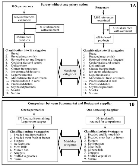 Diagrammatic representation of the food-item sorting considered in the different studies. (1A) Sorting applied to the global study of supermarkets and of the restaurant-supplier offerings. (1B) Sorting applied to the comparison between the two distribution circuits.