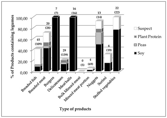 An initial analysis of the main food categories was performed classifying the food-products by their prices. This analysis was performed on eleven food categories presenting sufficient items, including breaded meat, breaded fish, burgers, delicatessen, fish steak, meatballs, minced meat in bulk, minced meat in portion, nuggets, stuffed vegetables, and surimi. In this initial analysis, all foodstuffs were treated together and dispatched into 7 price categories from 2.5 € to > 17.51 € per Kg (i.e., 2.50€–5.00€, 5.01€–7.50€, 7.51€–10.00€, 10.01€–12.50€, 12.51€–15.00€, 15.01€–17.50€, > 17.51€). This analysis did not show any significant differences between the proportions of the different legumes in each price category. A second analysis performed within each foodstuff category did not manage to show any significant findings because, generally, the number of food items was low, and the offerings were heterogeneous. Finally, an analysis was performed defining price-quintiles for each food category. The quintiles were different depending on the foodstuffs being considered (Table S6). The numbers of products containing soy, pea, no legumes or suspects were considered for each price-quintile. The number of products claiming to contain legumes or not (and percentages) per price-category is given in Table 3.