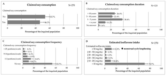 Main results of the survey performed on 270 premenopausal French women on their soy consumption. (A) Percentage of premenopausal women consuming soy-based products or not. (B) Duration of soy-based product consumption over women claiming regular soy intake. (C) Frequency of soy intake from all the inquired population (N = 270). (D) Estimated isoflavone intake based on the isoflavone foodstuff estimation (Table S10a). Data are percentages and error bars are confidence intervals calculated with a risk error of 5%.