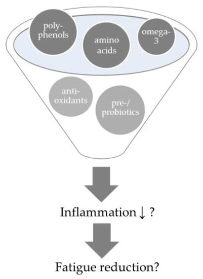 It appears that the occurrence of chronic disease-related fatigue is related to a pro-inflammatory status. The leading question is not only whether the inflammatory profile can be improved by nutrients with suggested anti-inflammatory properties, but also whether fatigue symptoms can in turn be affected (Figure 1). Different foods and nutrients which have been suggested to positively affect these pro-inflammatory pathways/markers are described in the following sections. Consequently, anti-inflammatory diets, which contain and combine several of those anti-inflammatory nutrients, are believed to work even better than single nutrients or foods. They will be reviewed in further sections. Table A1 gives a summary of evaluated human trials in this field.